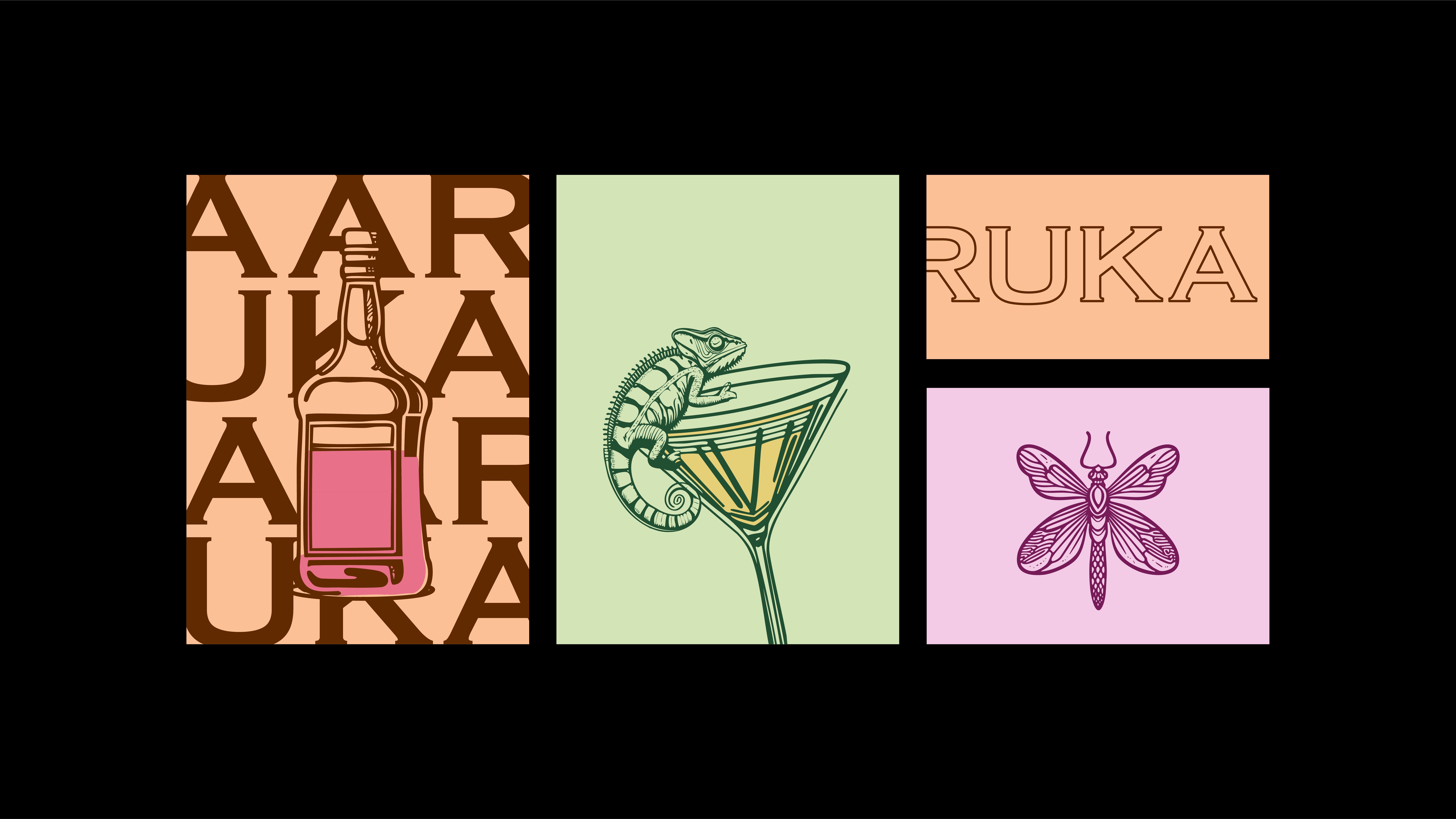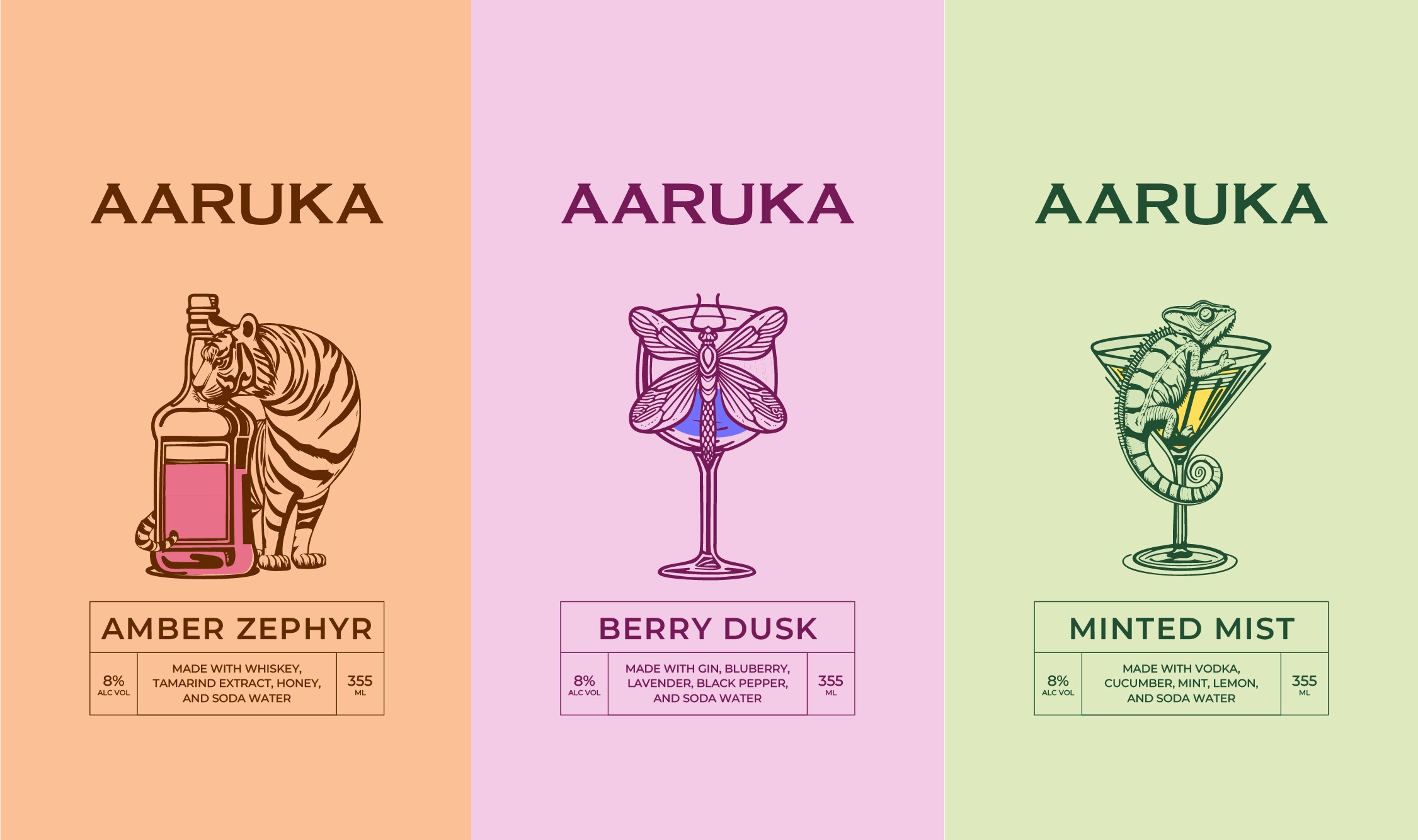 Creative Thinking & Illustration Concept for AARUKA Packaging Each AARUKA cocktail embodies an attitude, a personality, a reflection of nature’s wild elegance. By pairing each blend with a spirit animal, we bring its essence to life, creating an immersive, sensory drinking experience. Berry Dusk – The Dreamer A drink for those who embrace curiosity and imagination. The unique blend of blueberry, lavender, and pink pepper, brings a refreshing yet unexpected twist. Smooth and slightly floral, it’s a drink that lets you unwind while keeping your thoughts buzzing with new ideas. Amber Zephyr – The Bold Voyager A tiger stands confidently beside its potion, embodying strength, depth, and quiet power. This rich fusion of whiskey, tamarind, and honey is bold yet smooth, leaving a lasting impression. It’s crafted for those who move with purpose, lead with instinct, and savor life’s complexities. Minted Mist – The Playful Trickster A chameleon lounges on the rim of a martini glass, effortlessly cool yet always surprising. The refreshing blend of vodka, cucumber, and lemon is crisp, light, and full of zest, perfect for those who adapt, experiment, and embrace the unexpected.