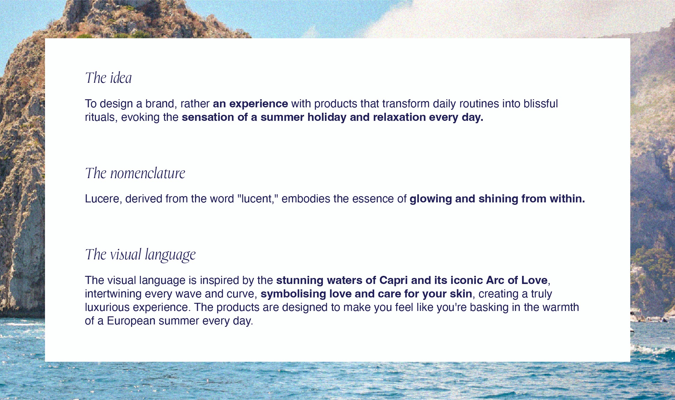 Lucere is a skincare brand that offers high-quality, multi-tasking formulas that cater to the need for effective skincare and the desire for a luxurious, sensory experience. The brand's products give users a naturally radiant, sun-kissed look while deeply nourishing and hydrating the skin. Each use transforms daily routines into blissful rituals, evoking the sensation of summer vibes and relaxation every day.