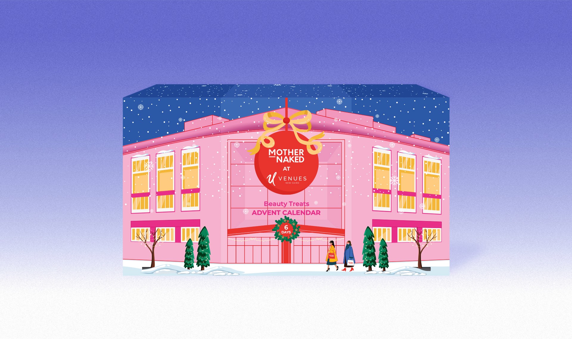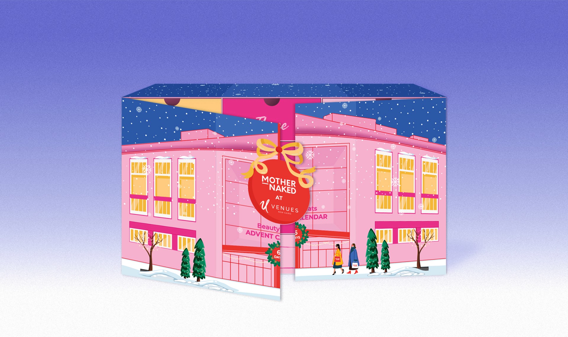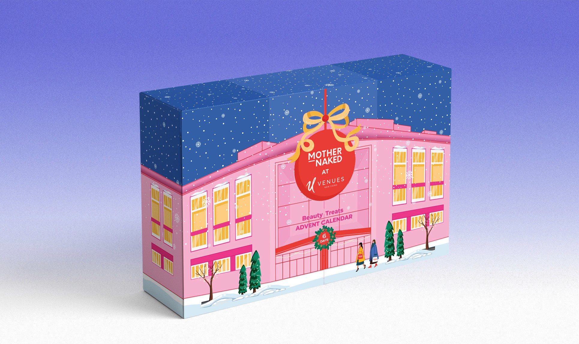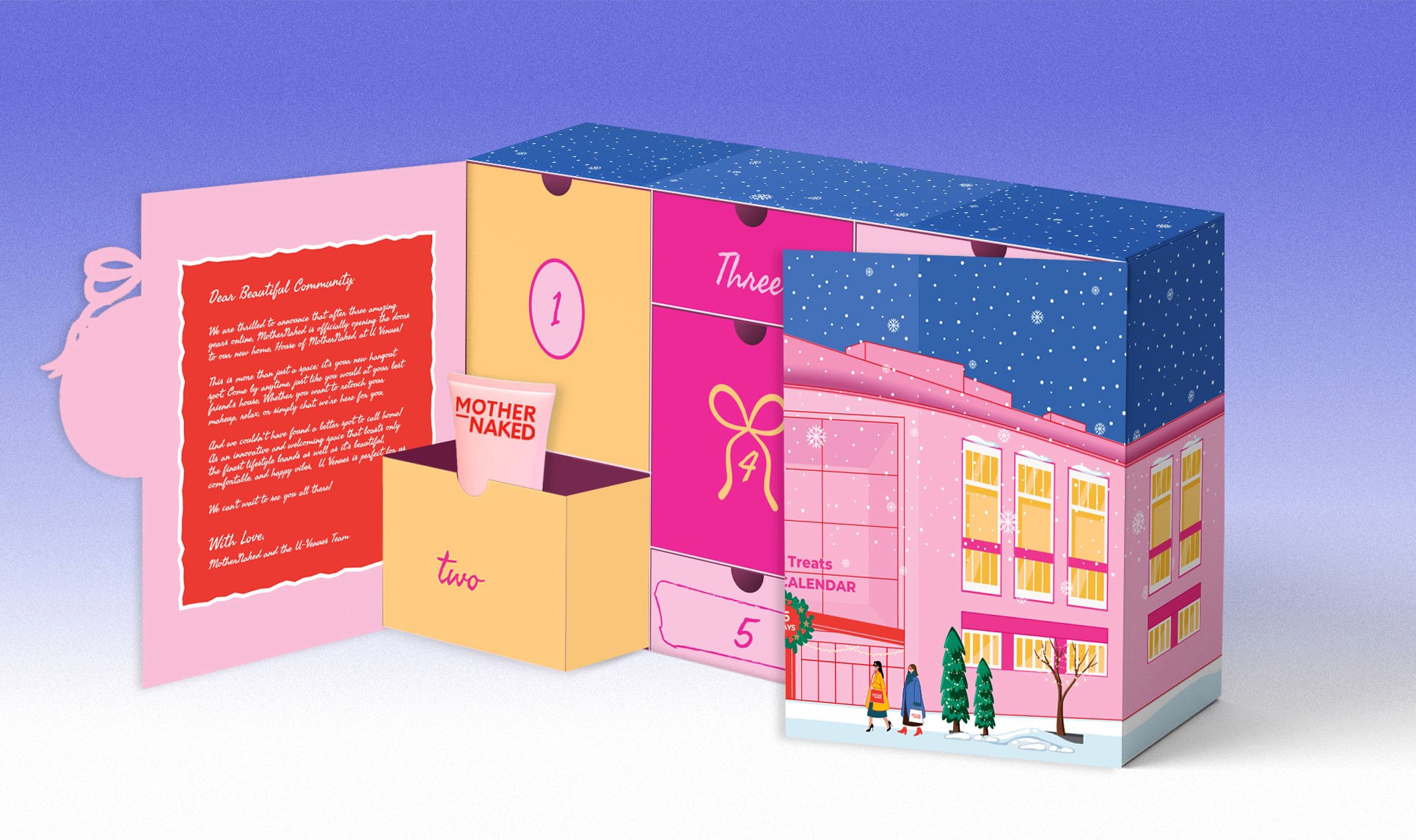 Mother Naked approached me to design an exclusive Winter Advent Calendar for their debut pop-up event in collaboration with UVenues, the city’s newest lifestyle destination. More than just packaging, the advent calendar was designed as a heartfelt gift for Mother Naked’s loyal patrons, inviting them into a world of beauty and self-care. The design features intricate illustrations that evoke a sense of warmth and wonder, inspired by UVenues' unique and elegant architecture, combined with Mother Naked’s bold colour palette and chic visual language. The final result seamlessly blended the essence of both brands, creating an eye-catching yet sophisticated holiday experience.